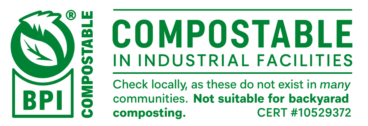 Our bags are BPI Certified and meet internationally recognized compostability standards. CERT #10529372